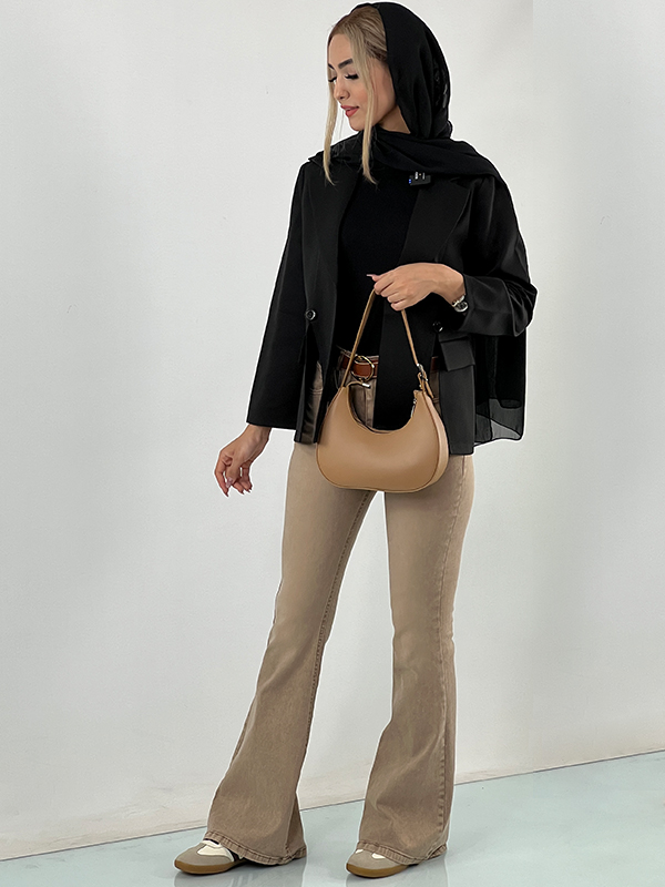 - کت بلند و ساختاردار: یه کت بلند (مثل مانتو کتی یا بلیزر) با رنگ خنثی یا متضاد با شلوارت بپوش. مثلاً شلوار سفید با کت مشکی، یا شلوار زیتونی با کت کرم، ترکیبهایی شیک و حرفهایان.