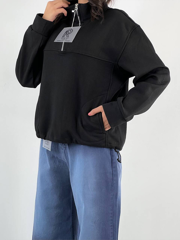 دورس نیمزیپ مشکی + شلوار جین تیره + کتانی سفید → ظاهر ساده و تمیز.